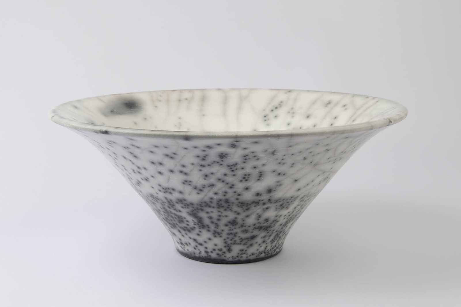 He is now a full-time potter working mainly in stoneware and porcelain fired in an electric kiln. Working on the wheel and then altering shapes after throwing, his work occupies ‘a space in my mind somewhere between painting and music – they explore rhythm, repetition and colour.’