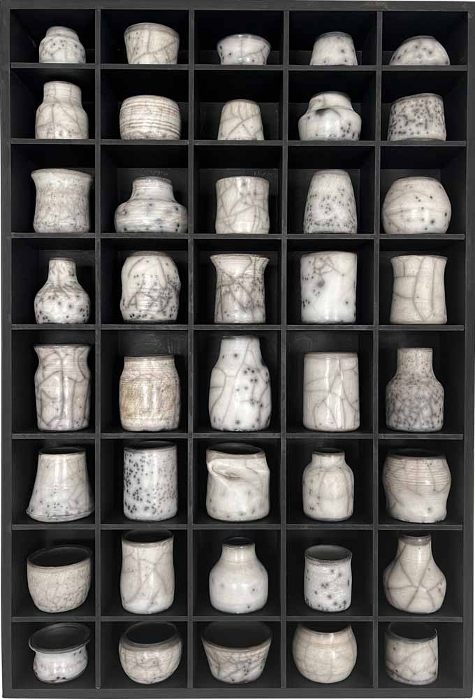 In this latest series of wall installations called his Pothecaries, Rupert explores ‘the infinite possibilities of bottle forms. Each bottle is unique yet they all share a basic form. I arrange them in patterns and rhythms which produce the aesthetic effect I am looking for.’