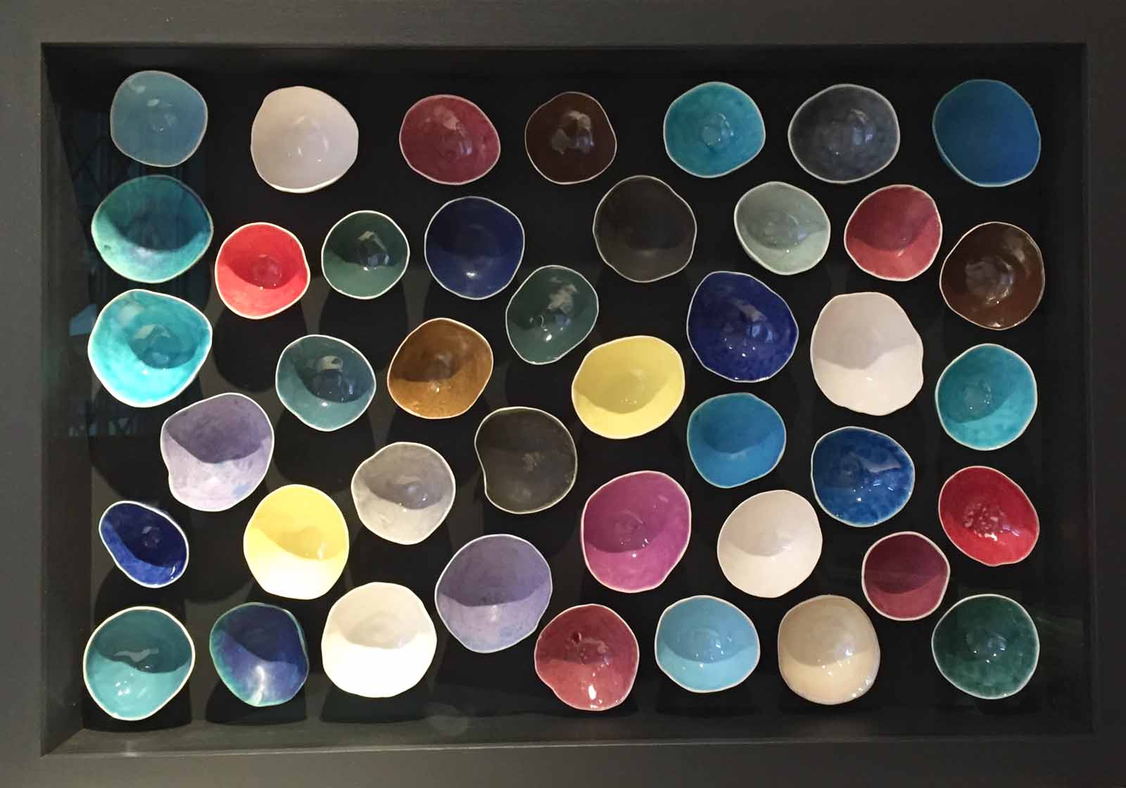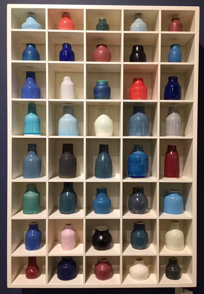 In this latest series of wall installations called his Pothecaries, Rupert explores ‘the infinite possibilities of bottle forms. Each bottle is unique yet they all share a basic form. I arrange them in patterns and rhythms which produce the aesthetic effect I am looking for.’