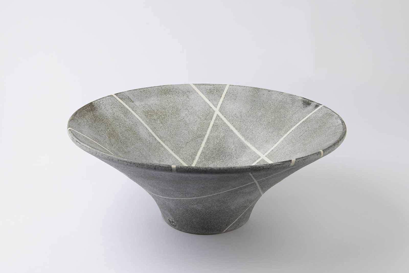 He is now a full-time potter working mainly in stoneware and porcelain fired in an electric kiln. Working on the wheel and then altering shapes after throwing, his work occupies ‘a space in my mind somewhere between painting and music – they explore rhythm, repetition and colour.’